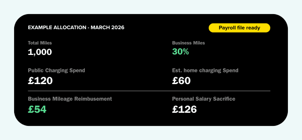 Home charging is estimated using an employer-configurable rate aligned to AER guidance. The rate can be adjusted as HMRC updates its advisory rates.